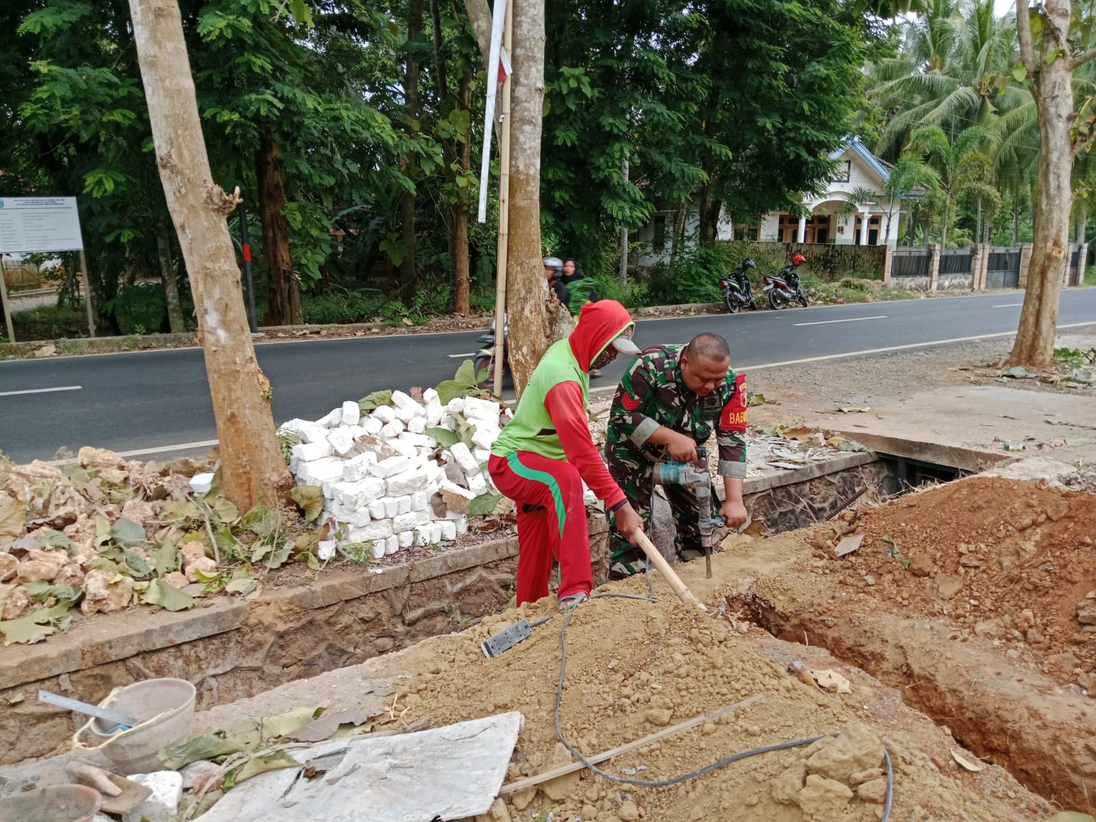 Kopka Hendy bersama beberapa warga bergotong royong untuk mempercepat pembangunan pondasi tersebut, sebagai bentuk dukungan dan sinergi TNI dengan masyarakat setempat.