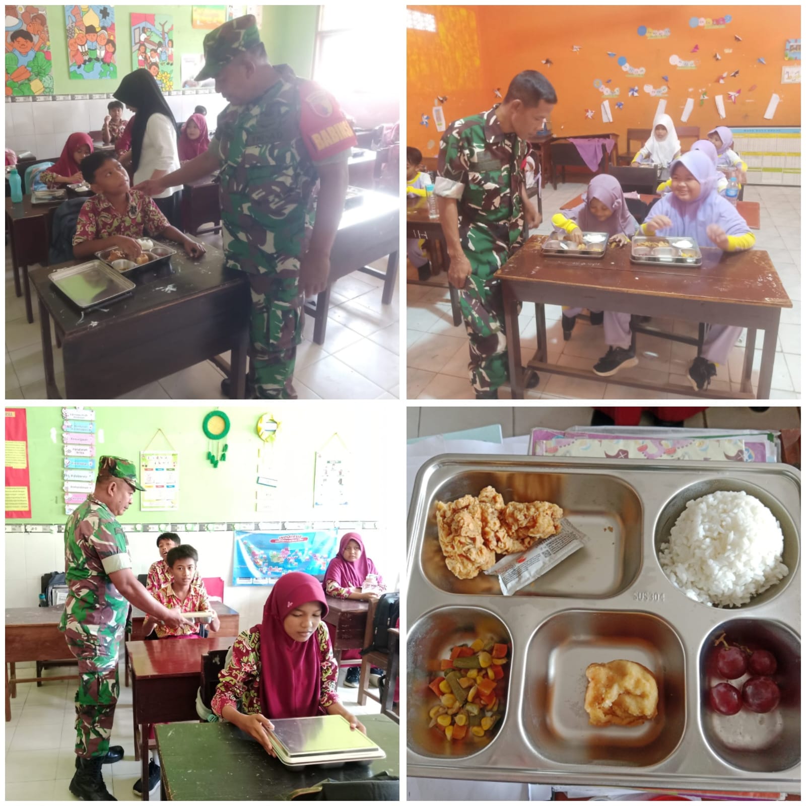Menu makanan yang dibagikan terdiri dari nasi, ayam, telur tepung, oseng sayur, dan buah anggur. Seluruh paket makanan telah melewati pengecekan kualitas sebelum disalurkan ke masing-masing sekolah.