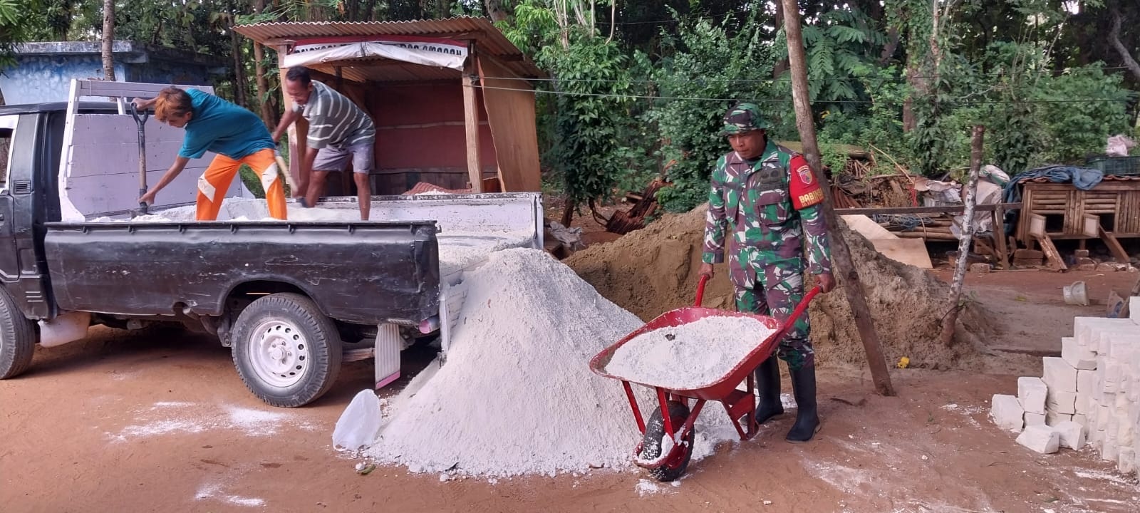 SUMENEP – Wujud kebersamaan dan berperan aktif mengatasi kesulitan rakyat di wilayah binaan dituangkan oleh Babinsa Koramil 11/Pasongsongan Kodim 0827/Sumenep Serda Dadang Sulistyo dengan melibatkan diri secara langsung dalam pelaksanaan gotong royong membangun rumah warga binaannya di Desa Pasongsongan Kecamatan Pasongsongan Kabupaten Sumenep, Minggu (20/4/2025).