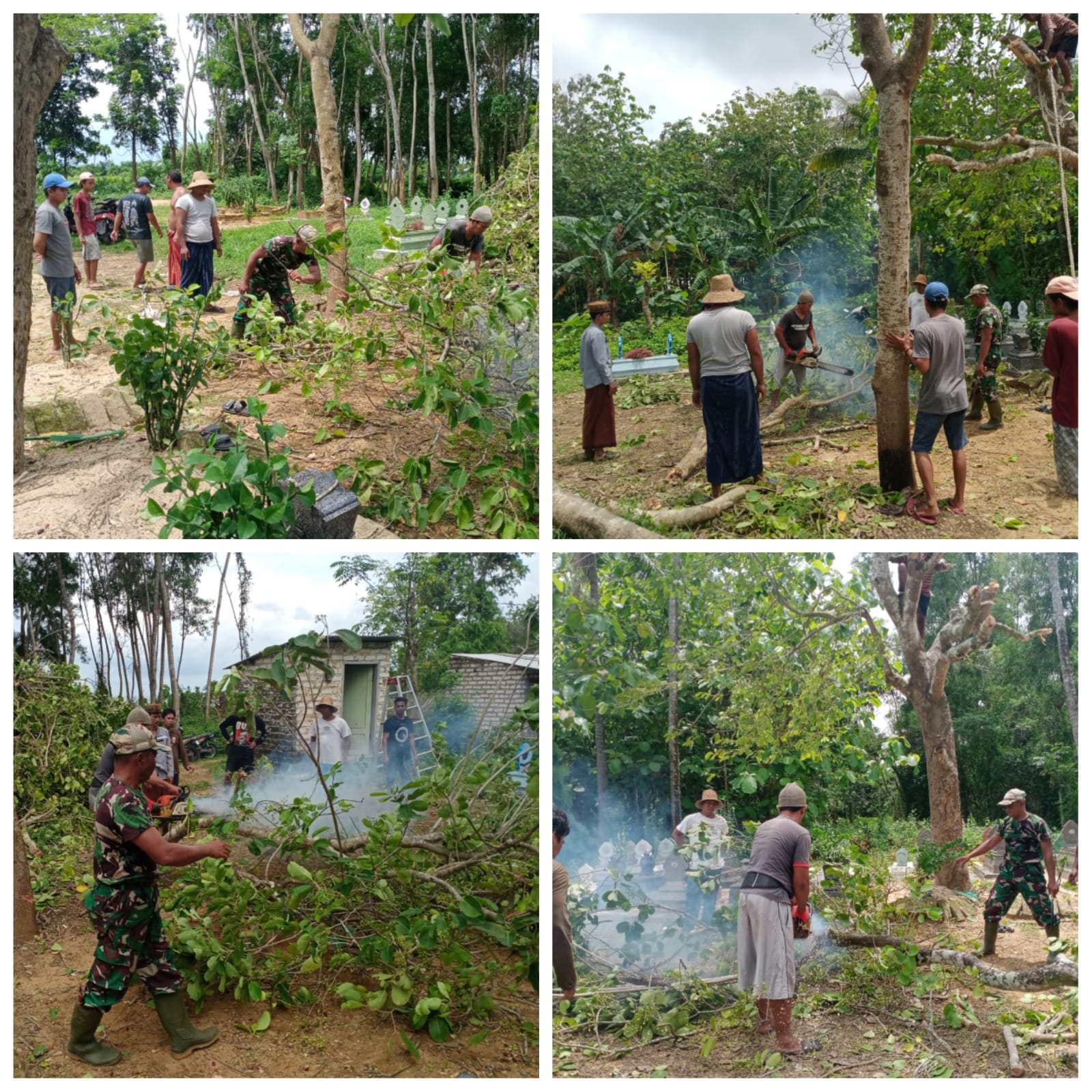 SUMENEP – Personel Babinsa Koramil 0827/12 Dasuk, Serka Umar, melaksanakan kegiatan karya bakti (Karbhak) dengan membantu warga membersihkan area makam umum di Desa Slopeng, Kecamatan Dasuk, Kabupaten Sumenep.Selasa (25/11/2025).