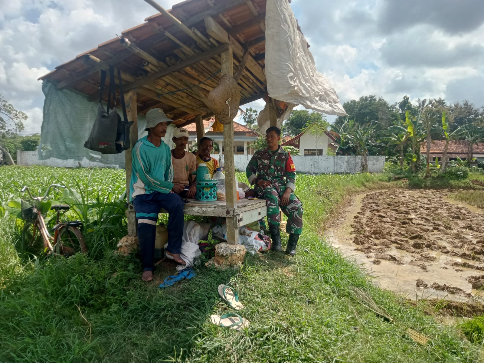 Dalam menjalin komunikasi sosial antara aparat komando kewilayahan dengan masyarakat bisa dilakukan di mana saja. Seperti yang dilakukan Babinsa Sertu Surya Wahyudi dengan melakukan komsos bersama petani yang sedang istirahat di gubuk tengah sawah.