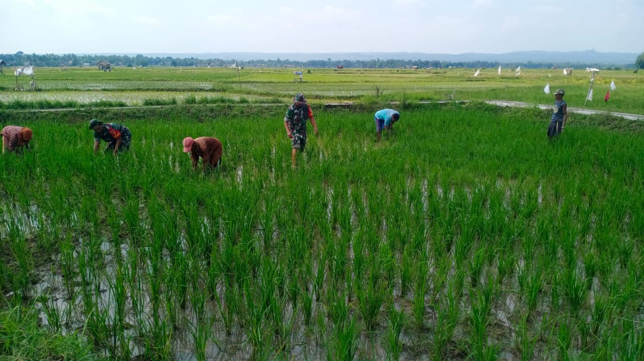Serka Akhmad Huda bersama para petani setempat secara gotong royong membersihkan gulma yang tumbuh di sekitar tanaman padi yang dapat menghambat pertumbuhan dan produktivitas tanaman.