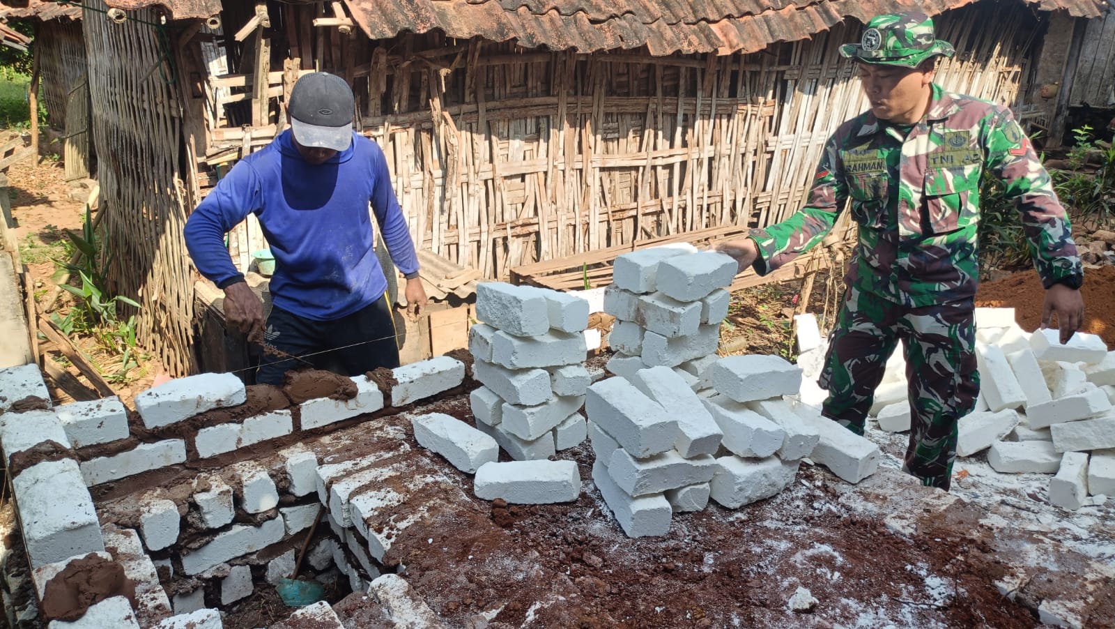 “Hari ini kita bangun tembok dengan bata secara beramai ramai cepat selesai dan melibatkan beberapa warga yang tulus ikhlas bersedia membantu pembangunan pagar ini”, ujar Kopda Ainur Rahman.