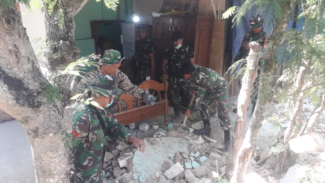 SUMENEP – Prajurit TNI dari Koramil 0827/20 Sapudi terus menunjukkan kepeduliannya terhadap masyarakat terdampak gempa bumi yang mengguncang Pulau Sapudi, Kabupaten Sumenep.