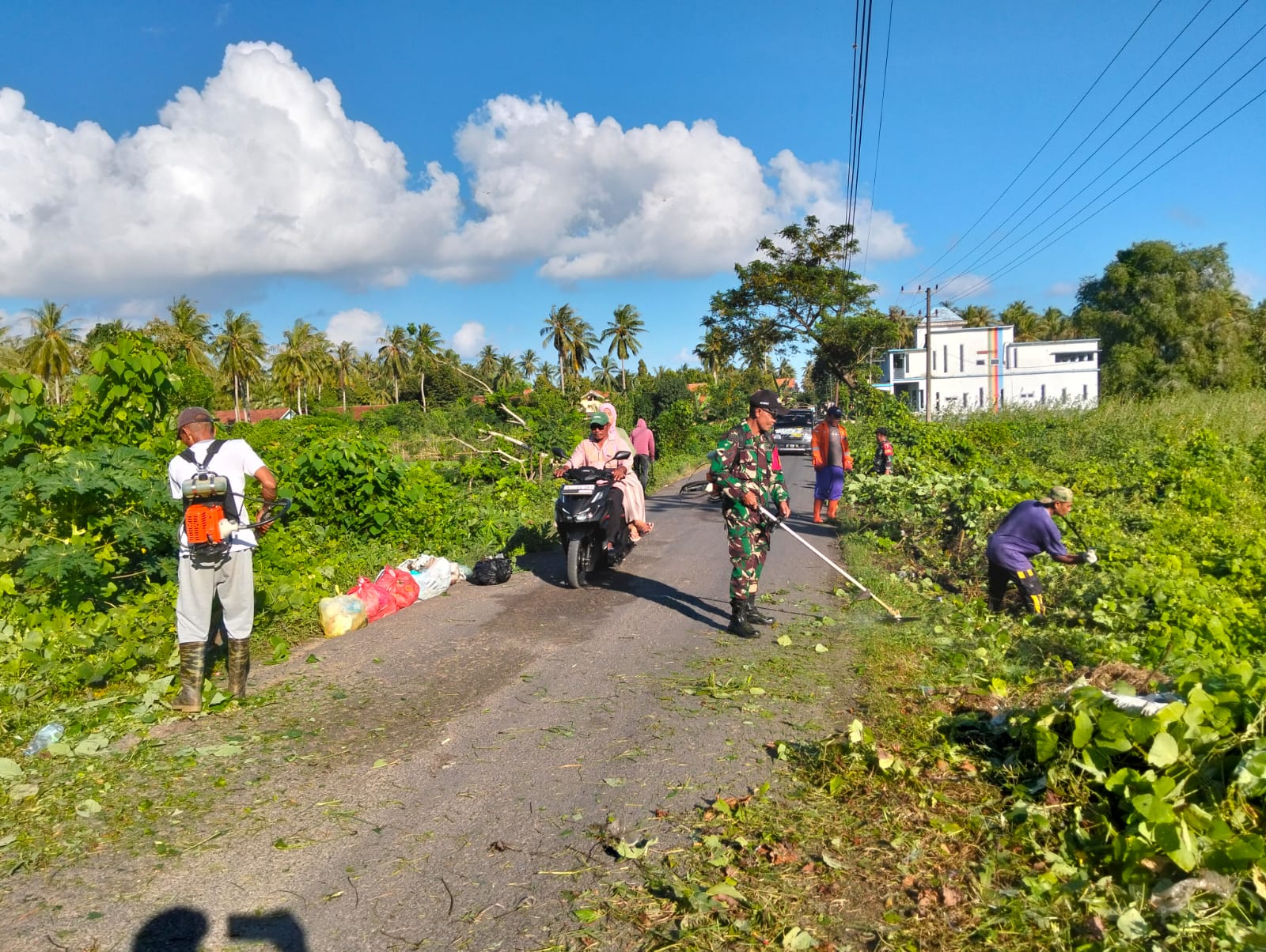Dengan semangat kebersamaan, Babinsa bersama masyarakat bergotong royong memangkas rumput-rumput yang mulai rimbun dan berpotensi menutupi badan jalan.