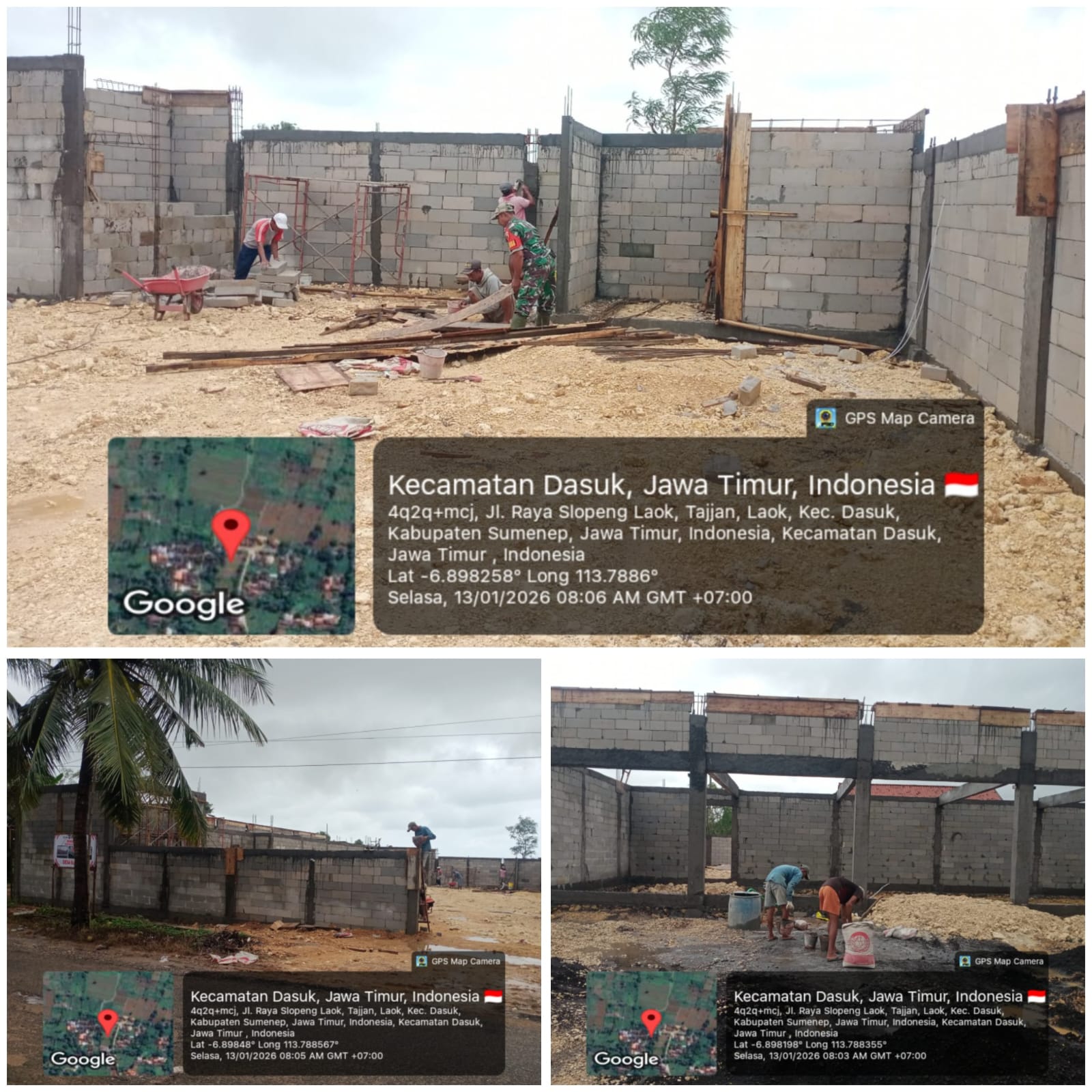 Sumenep – Pembangunan Gedung Koperasi Desa/Kelurahan Merah Putih di Desa Slopeng, Kecamatan Dasuk, Kabupaten Sumenep, Jawa Timur, memasuki tahap pemasangan bata ringan dan pengerjaan fasilitas kamar mandi, Selasa (13/1/2026).