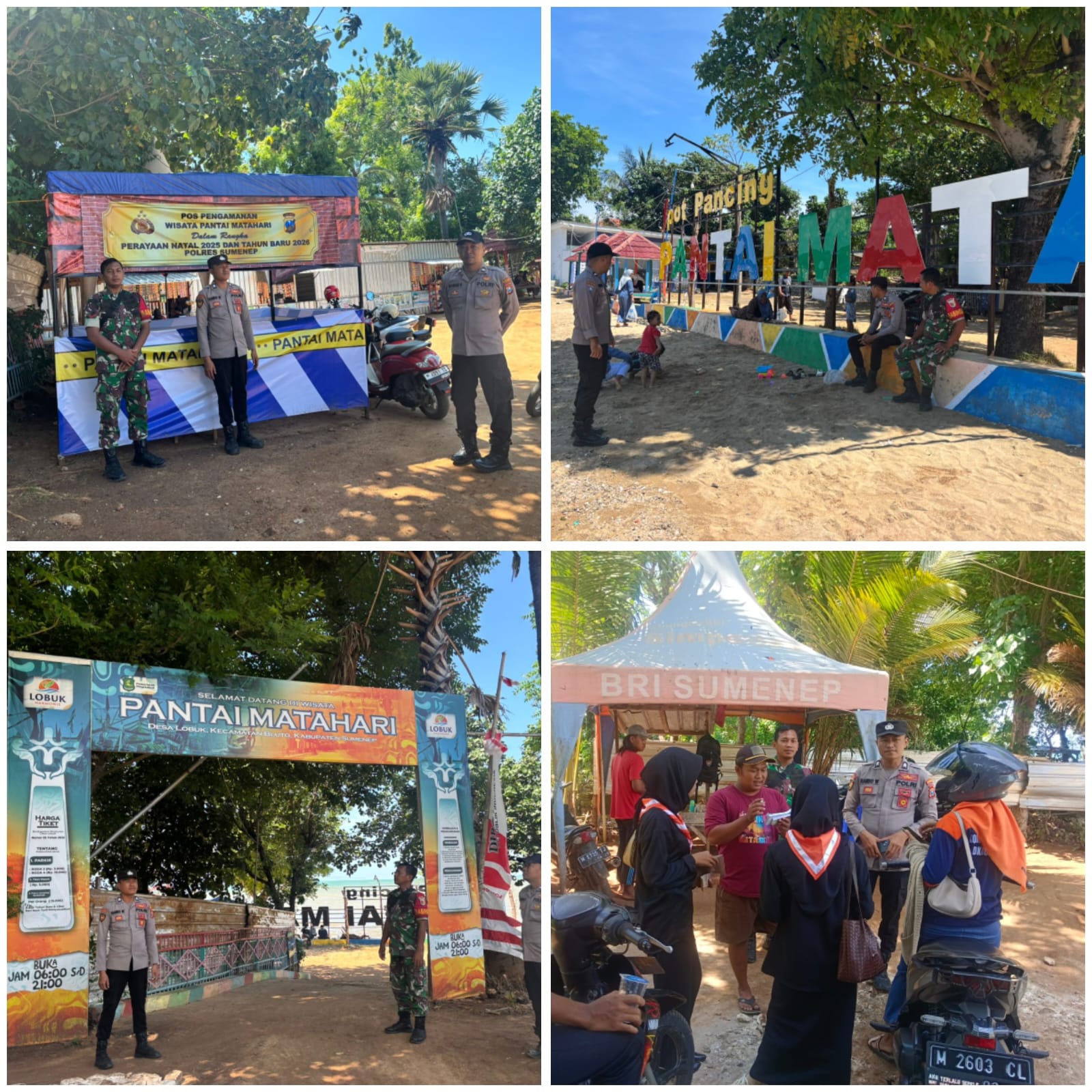 SUMENEP – Aparat gabungan TNI, Polri, dan tenaga kesehatan melaksanakan pengamanan intensif di objek wisata Pantai Matahari, Desa Lobuk, Kecamatan Bluto, Kabupaten Sumenep, Kamis (25/12/2025).
