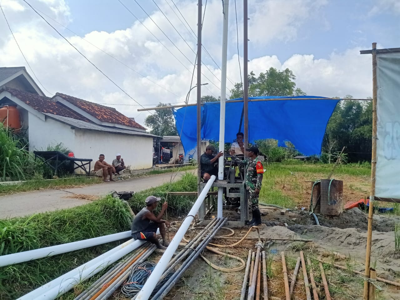 SUMENEP – Babinsa Koramil 0827/11 Pasongsongan Serda Dadang Sulistyo melaksanakan pendampingan pembuatan sumur bor di Desa Lebeng Barat, Kecamatan Pasongsongan, Kabupaten Sumenep. Minggu (27/4/2025).