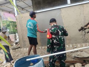 Sumenep, Jatim | suaranasionalnews.co.id – Bintara pembina Desa Babinsa Koramil 06/Saronggi jajaran Kodim 0827/Sumenep Serda Hosman membantu warga binaan membangun rumah di Desa Aeng Tongtong Kecamatan Saronggi Kabupaten Sumenep, Senin (2/6/2025).