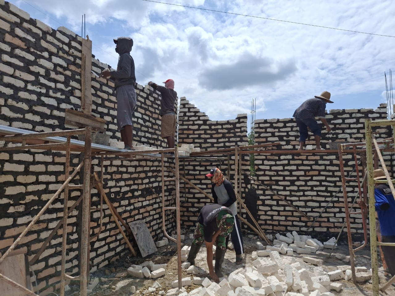 Peninggian dinding dengan pemasangan batu bata menjadi fokus pekerjaan saat ini. Kegiatan tersebut dilaksanakan Satgas TMMD bersama masyarakat setempat secara gotong royong, meski berlangsung di tengah terik matahari dan suasana bulan Ramadan.
