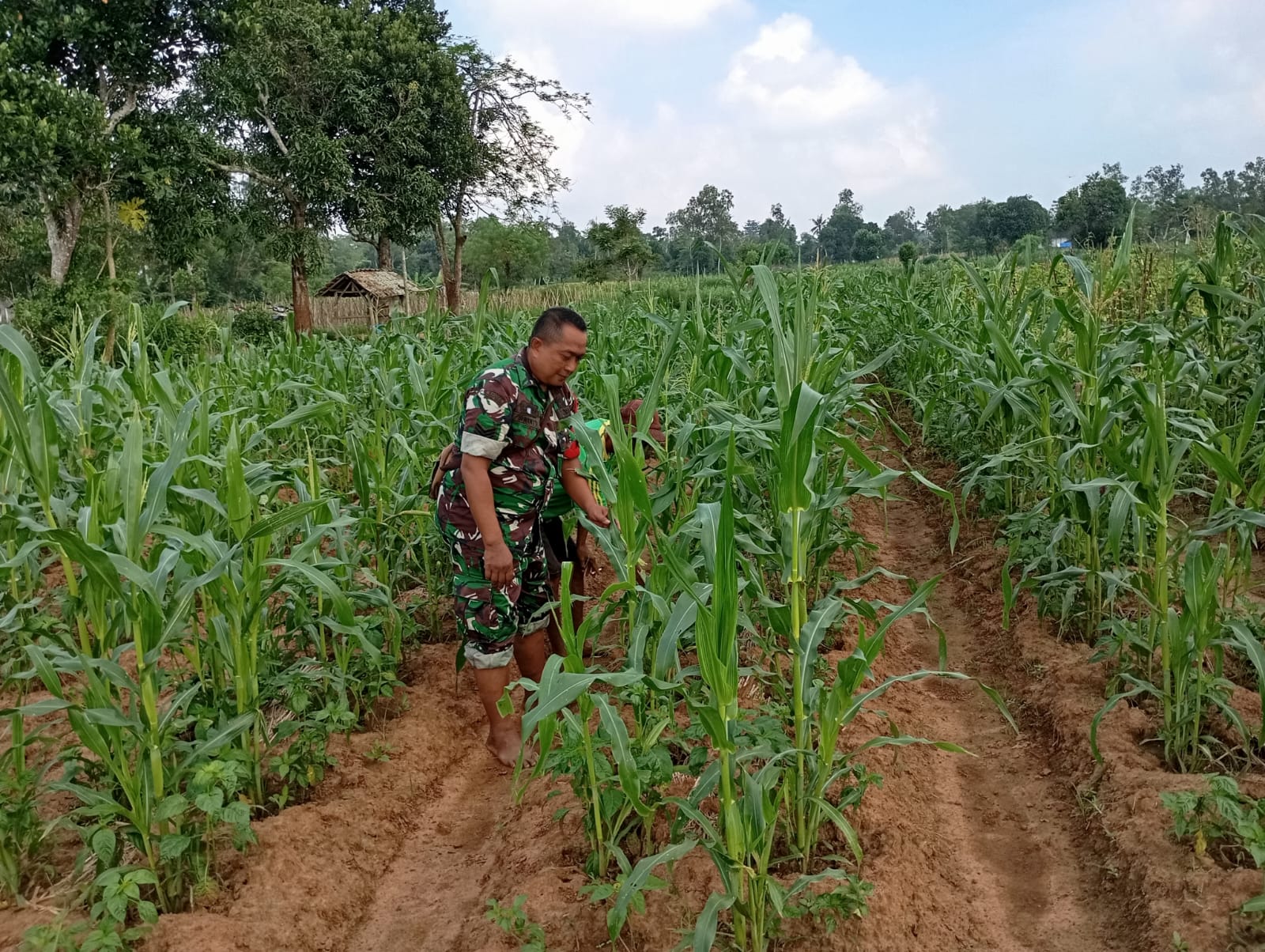 SUMENEP – Personel Babinsa Koramil 0827/13 Rubaru, Serma Irwanto, terjun langsung membantu warga binaan dalam merawat tanaman jagung di Desa Matanaair, Kecamatan Rubaru, Kabupaten Sumenep. Selasa (30/9/2025).