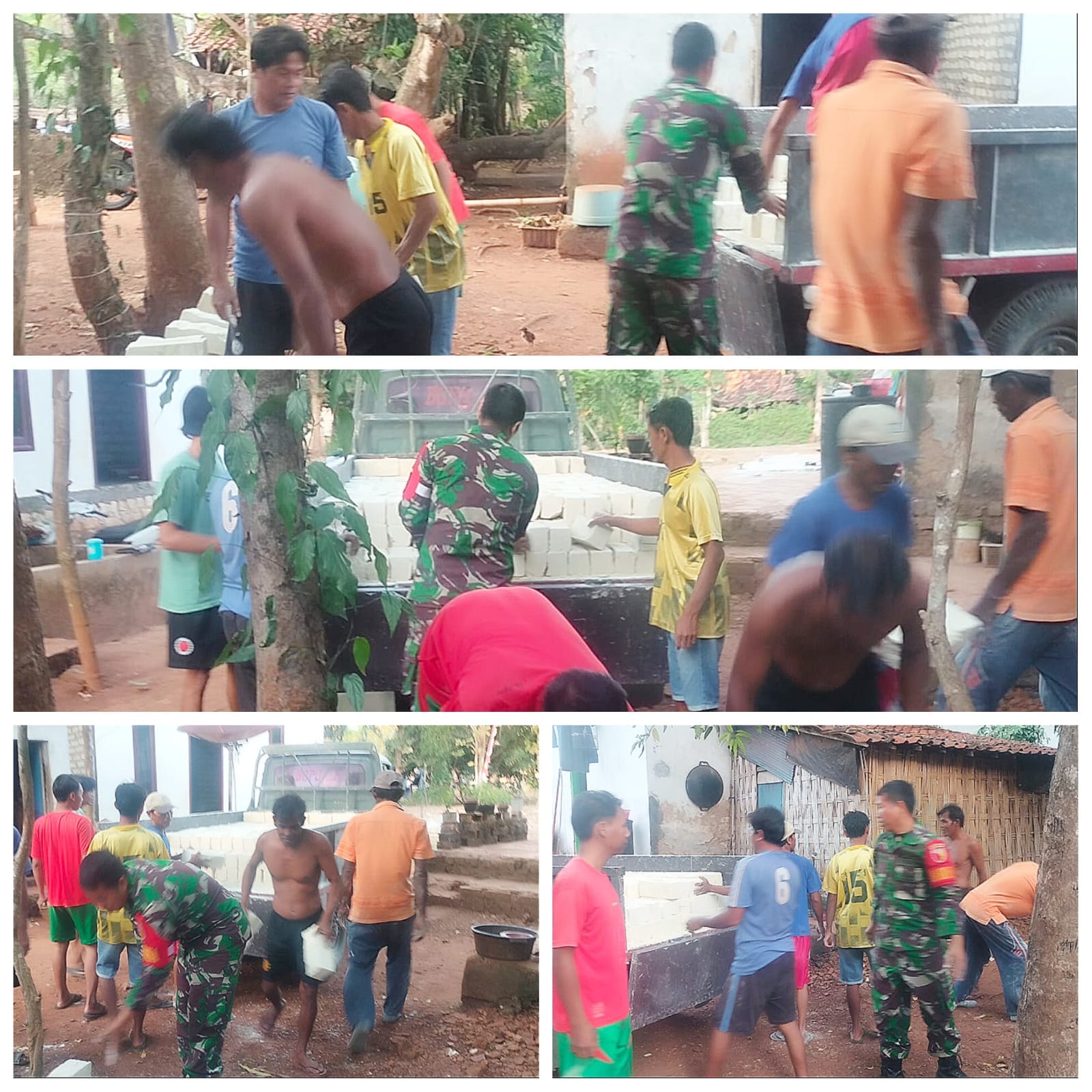 SUMENEP – Bintara pembina Desa Babinsa Koramil 11/Pasongsongan jajaran Kodim 0827/Sumenep Kopda Efendi membantu warga binaan membangun rumah dengan bergotong royong angkat bata bersama masyarakat di Desa Pasongsongan Kecamatan Pasongsongan Kabupaten Sumenep, Sabtu (8/11/2025).