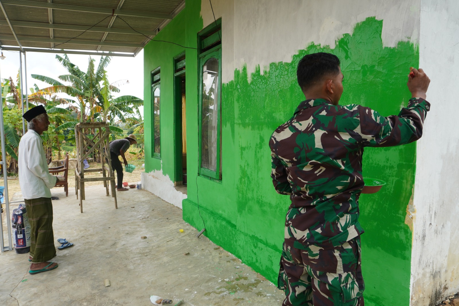 Serda Ismail selaku personel Satgas TMMD memimpin langsung proses pengecatan menggunakan warna hijau khas TNI Angkatan Darat. Cat diaplikasikan pada bagian eksterior dan interior rumah untuk memperkuat lapisan dinding sekaligus memperindah tampilan bangunan.