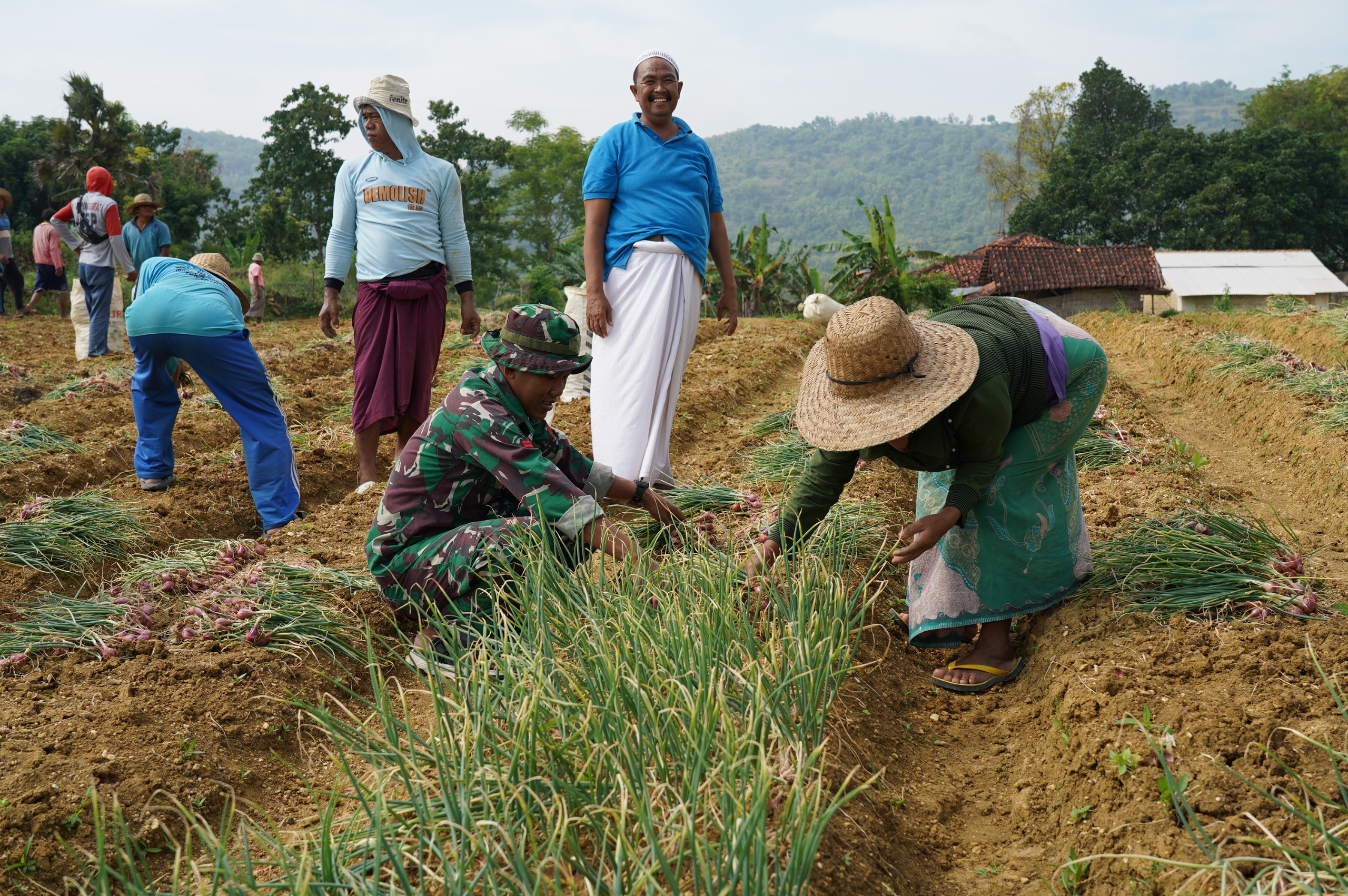 Sejak pagi, prajurit dan anggota Polri bersama petani mencabut bawang merah, membersihkan, mengikat, hingga mengangkut hasil panen ke lokasi penampungan. Kehadiran mereka membuat proses panen lebih cepat dan efisien, terutama saat musim panen raya yang membutuhkan banyak tenaga.