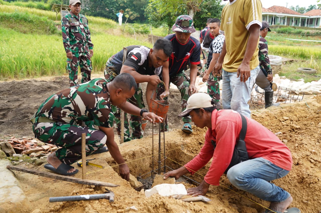 Pengecoran pondasi menjadi tahap krusial dalam memastikan rumah yang dibangun melalui program TMMD kokoh dan tahan lama bagi penerima manfaat.