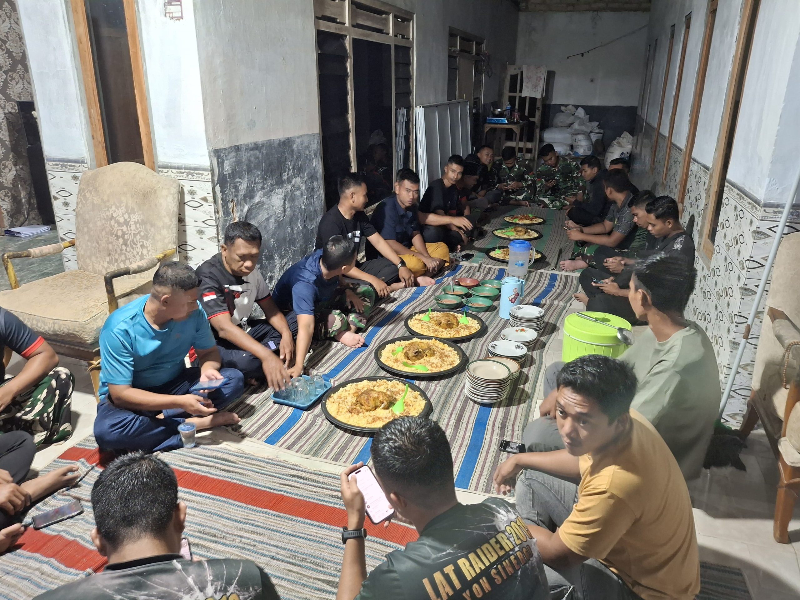 Suasana hangat dan penuh kekeluargaan terlihat saat personel TNI duduk bersama warga menikmati hidangan sederhana yang telah disiapkan.