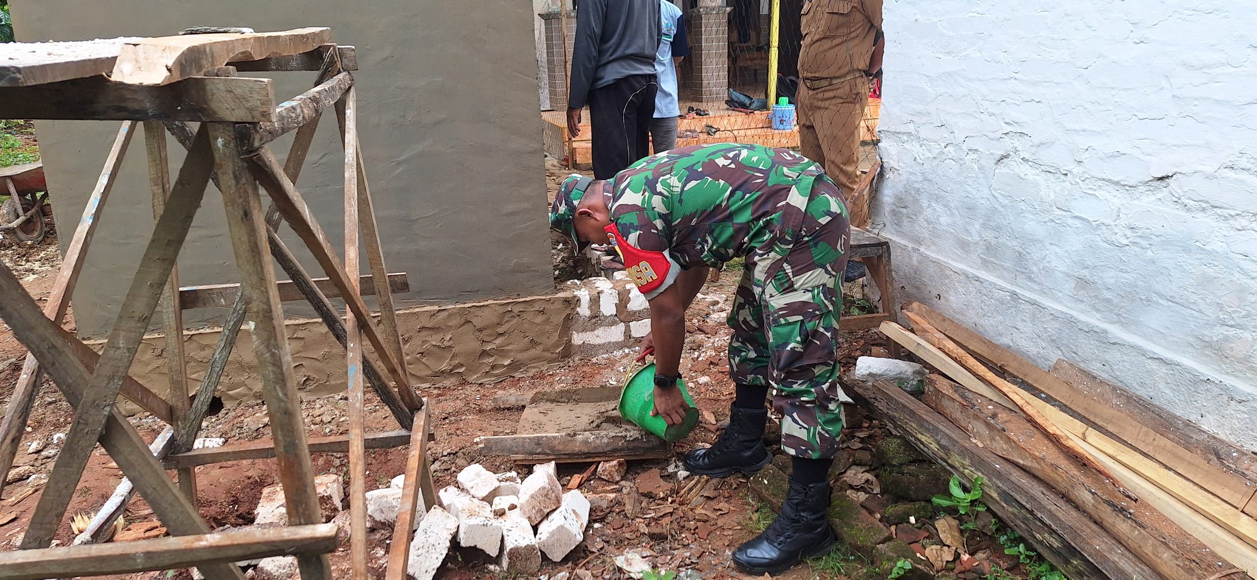 SUMENEP – Wujud kebersamaan dan berperan aktif mengatasi kesulitan rakyat di wilayah binaan dituangkan oleh Babinsa Koramil 17/Dungkek Kodim 0827/Sumenep Kopda Samaul Anam dengan melibatkan diri secara langsung dalam pelaksanaan gotong royong membangun rumah warga binaannya di Desa Romben Guna Kecamatan Dungkek Kabupaten Sumenep, Rabu (9/7/2025).