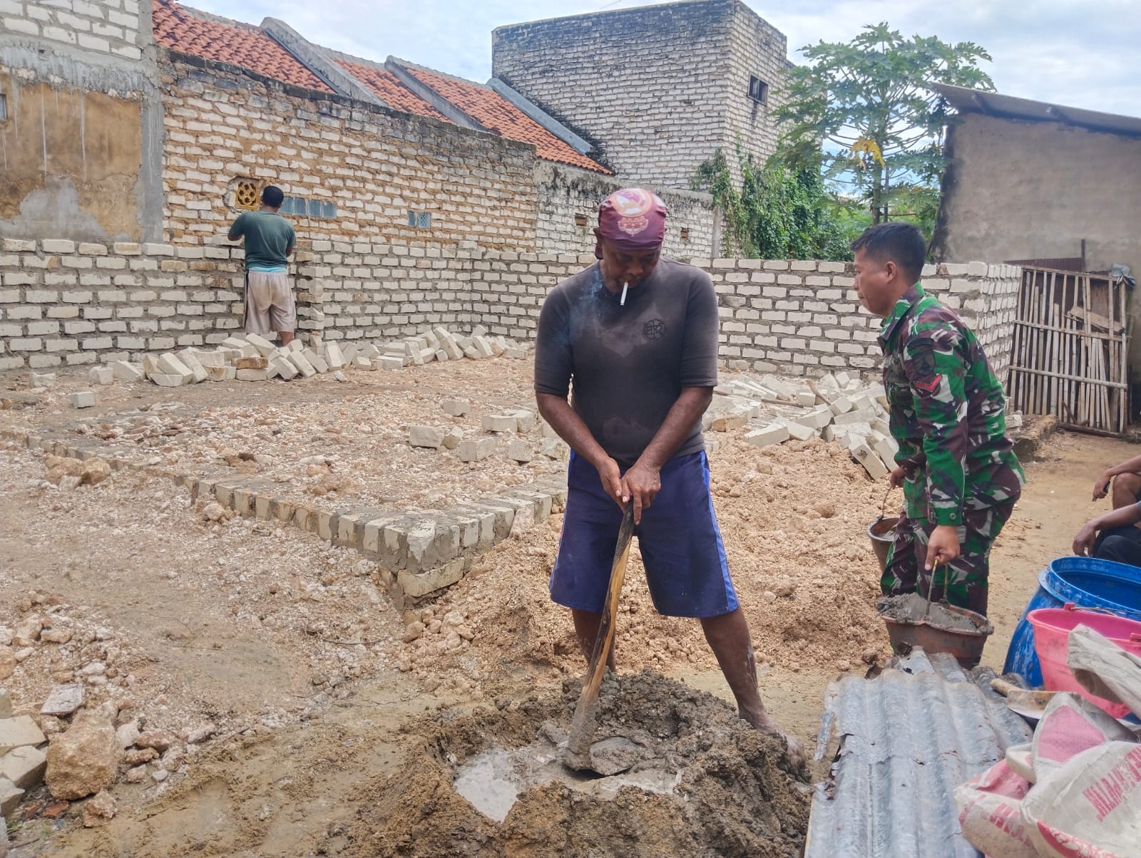 SUMENEP – Guna terciptanya sinergitas TNI bersama rakyat, Babinsa Koramil 11/Pasongsongan Kodim 0827/Sumenep Kopda Fendi melaksanakan karya bakti membantu warga binaan membangun rumah yang berada di Desa Pasongsongan Kecamatan Pasongsongan Kabupaten Sumenep, Selasa (27/5/2025).