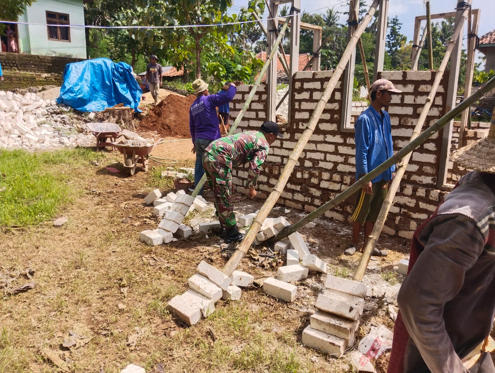SUMENEP – Guna terciptanya sinergitas TNI bersama rakyat, Anggota Koramil 11/Pasongsongan Kodim 0827/Sumenep Serda Joni Dwi Winarno melaksanakan karya bakti membantu membangun rumah warga binaan yang bertempat di Desa Padangdangan Kecamatan Pasongsongan Kabupaten Sumenep, Sabtu (19/4/2025).