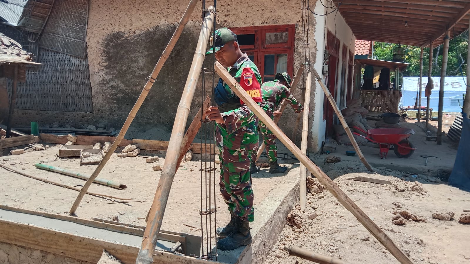 SUMENEP – Kepedulian terhadap warga terdampak bencana kembali ditunjukkan oleh prajurit TNI. Babinsa Koramil 0827/20 Sapudi, Serka Bambang, turun langsung membantu proses pembangunan rumah milik Ibu Sumaliyah, warga Dusun Prambanan, Desa Prambanan, Kecamatan Gayam, Kabupaten Sumenep, yang rusak akibat gempa beberapa waktu lalu.