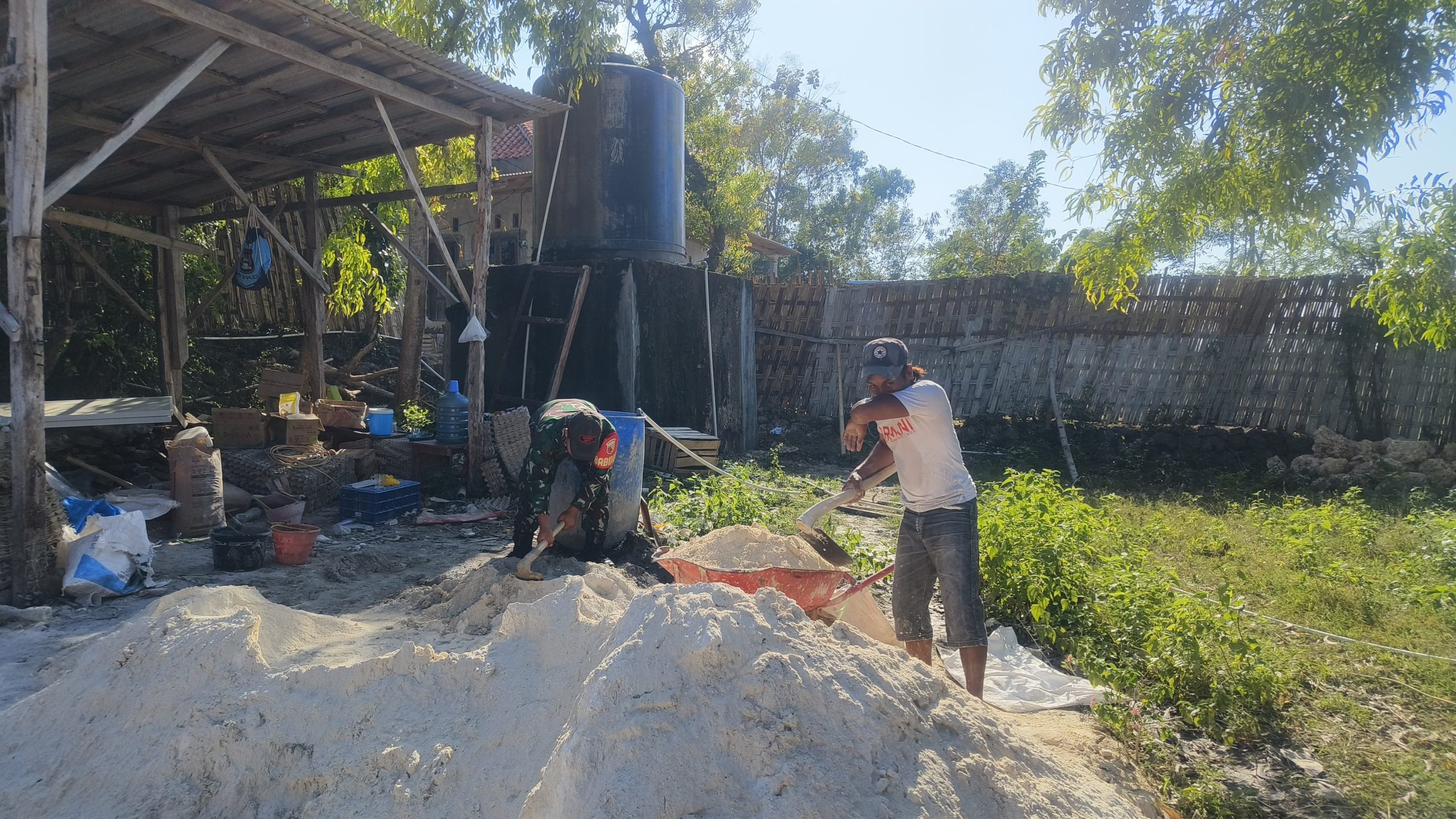 SUMENEP – Babinsa Koramil 04/Bluto Kodim 0827/Sumenep Sertu Muhammad Agung membantu warga yang sedang bekerja membangun rumah yang bertempat di Desa Masaran Kecamatan Bluto Kabupaten Sumenep, Jumat (19/9/2025).