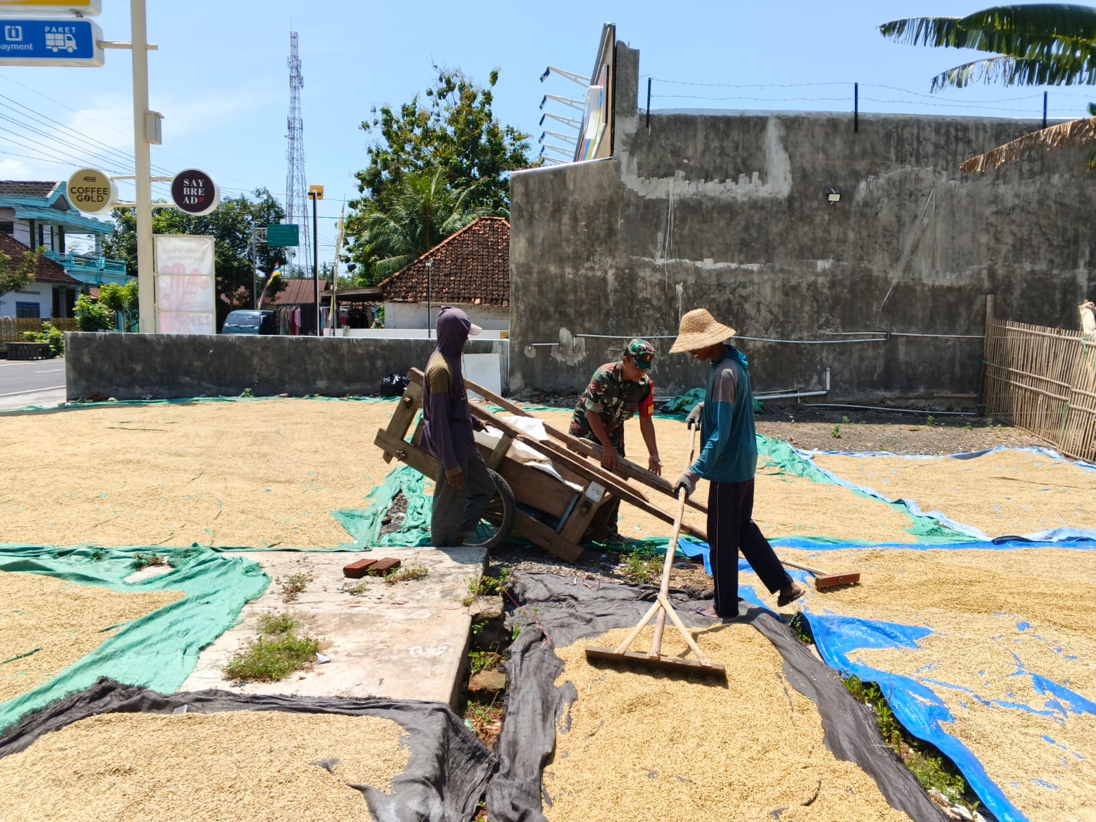 Hal tersebut ditunjukkan oleh anggota Koramil 0827/16 Gapura Serka Mofiq yang turut membantu para petani menjemur hasil panen padi di Desa Gapura Barat Kecamatan Gapura Kabupaten Sumenep, (23/3/2026).