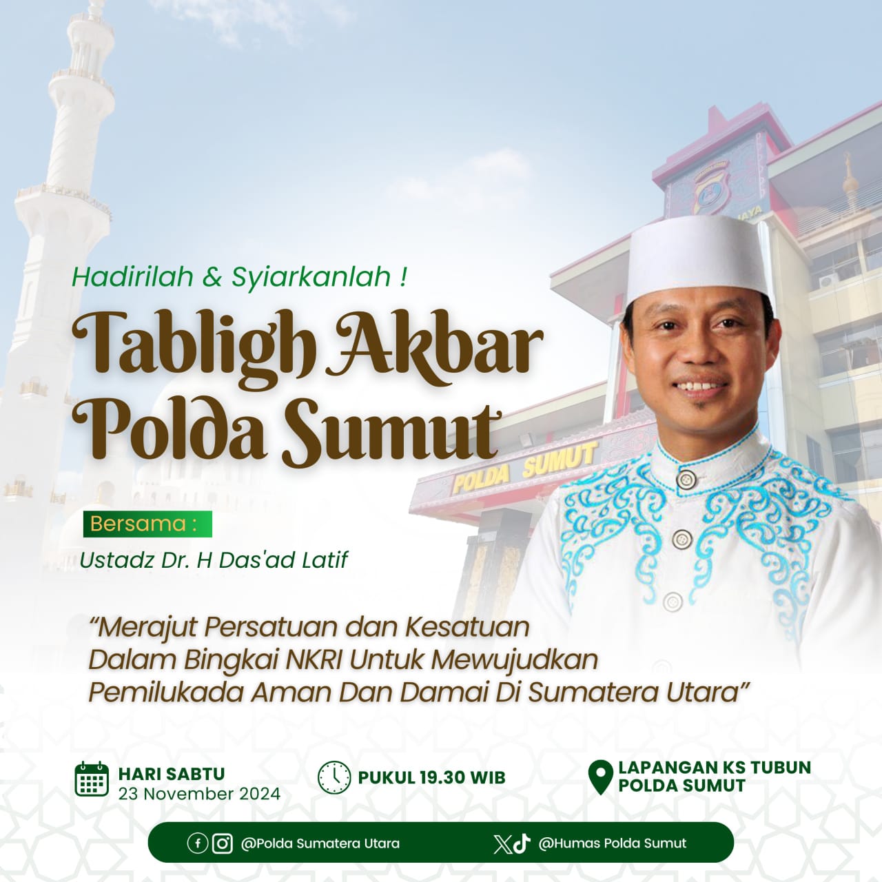 MEDAN – Polda Sumut akan menggelar Tabligh Akbar 1446 H pada Sabtu, 23 November 2024, di Lapangan KS Tubun, Mapolda Sumut, pukul 19.00 WIB. Menghadirkan Al-Ustadz Dr. H. Das’ad Latif, Ph.D., acara bertema “Merajut Persatuan dan Kesatuan dalam Bingkai NKRI untuk Mewujudkan Pemilukada Aman dan Damai di Sumatera Utara”.