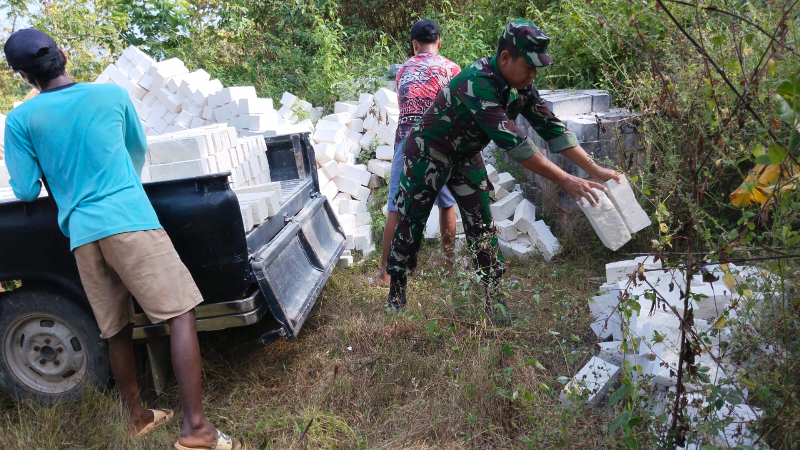 Sumenep – Dalam rangka meningkatkan kesejahteraan masyarakat dan memupuk rasa kebersamaan Babinsa Koramil 11/Pasongsongan Kodim 0827/Sumenep Seda Suyono bersama warga membantu menurunkan bata di Desa Pasongsongan Kecamatan Pasongsongan Kabupaten Sumenep, Minggu (14/9/2025).