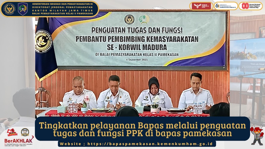 Pamekasan – Balai Pemasyarakatan Kelas II Pamekasan (Bapas Pamekasan) Kanwil Direktorat Jenderal Pemasyarakatan Jawa Timur menggelar kegiatan Penguatan Tugas dan Fungsi Pembantu Pembimbing Kemasyarakatan (PPK) se-Korwil Madura pada Kamis (04/09/2025).