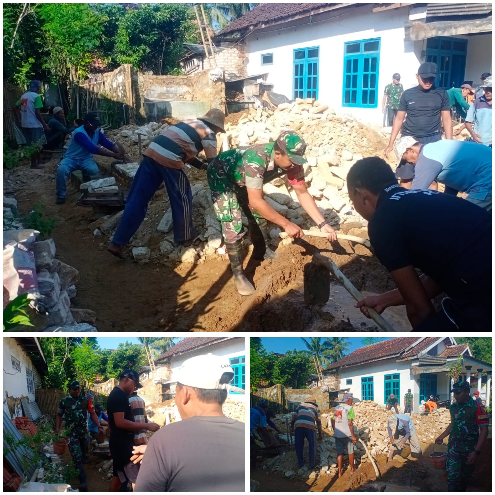 SUMENEP — Babinsa Koramil 0827/11 Pasongsongan, Serda Didik, bersama warga melaksanakan kegiatan kerja bakti pembuatan pondasi rumah milik warga di Desa Rajun, Kecamatan Pasongsongan, Kabupaten Sumenep, Madura, Jawa Timur, Jumat (30/1/2026).