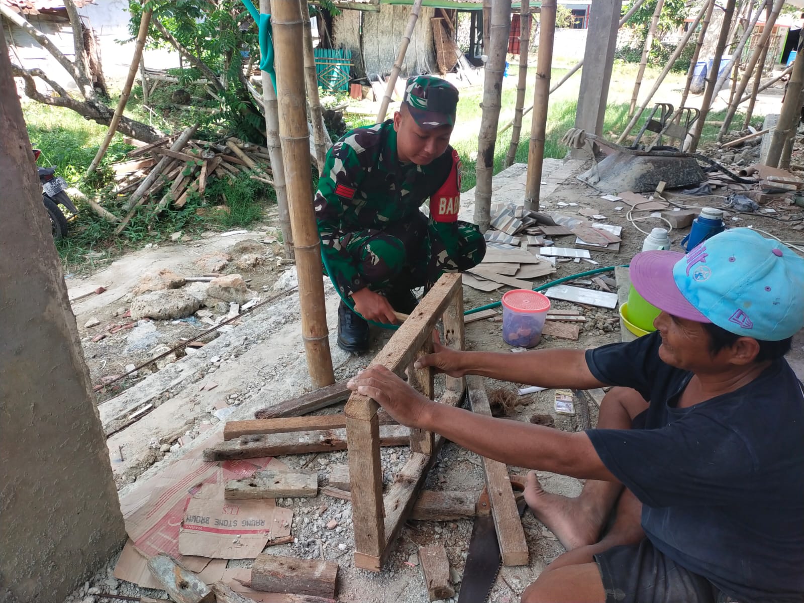 SUMENEP – Disela waktu dinas Babinsa Koramil 21/Raas Kodim 0827/Sumenep Praka Dani menyempatkan diri melaksanakan kerja bakti membantu warga membangun rumah di Desa Brakas Kecamatan Raas Kabupaten Sumenep, Selasa (29/7/2025).