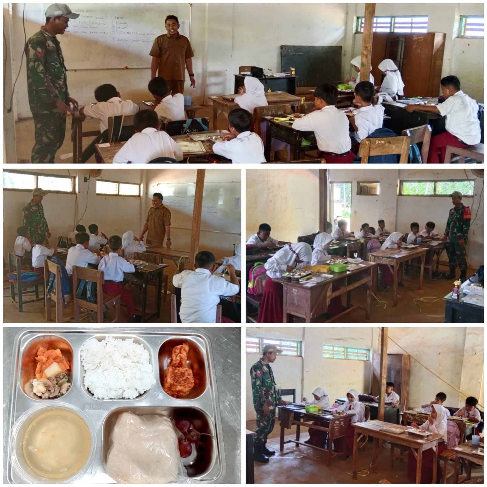 Menu yang disajikan dalam program MBG kali ini terdiri dari nasi putih, sayur sop daging, tahu bumbu, kerupuk ikan, serta buah anggur. Distribusi dilakukan menggunakan tiga unit mobil box pickup guna memastikan makanan tiba tepat waktu dan dalam kondisi layak konsumsi.