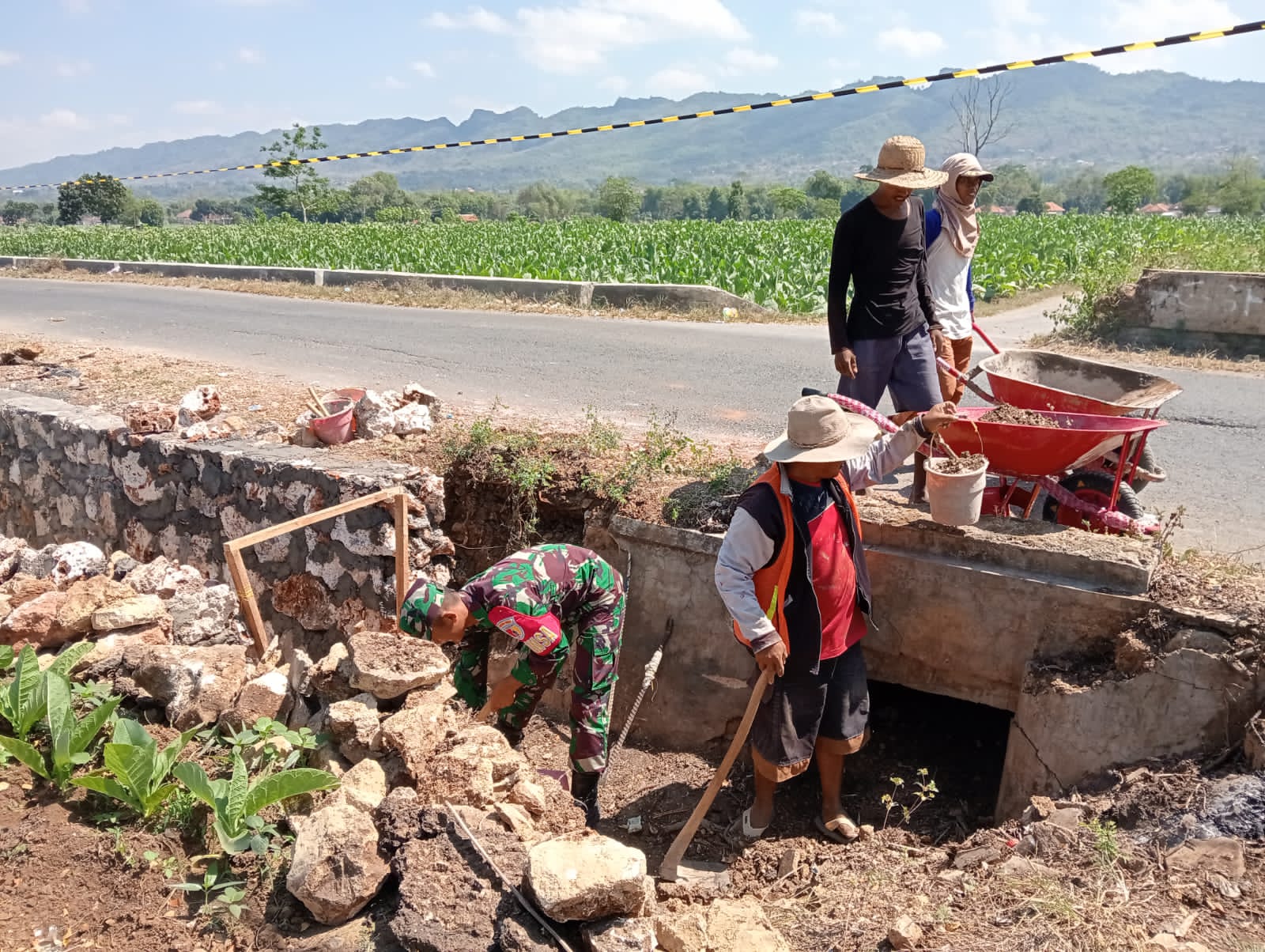 SUMENEP – Dalam semangat kebersamaan dan kepedulian terhadap ketahanan pangan, warga bersama personel TNI dari Koramil 0827/07 Guluk Guluk menggelar kegiatan gotong royong membangun saluran irigasi di area persawahan desa.