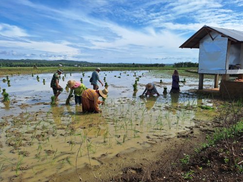 Seperti halnya yang dilakukan Babinsa Sertu Muhayyi tak segan – segan untuk terjun langsung ke sawah, membantu para petani untuk menanam di lahan milik warga binaannya seluas ± 4,7 hektar.