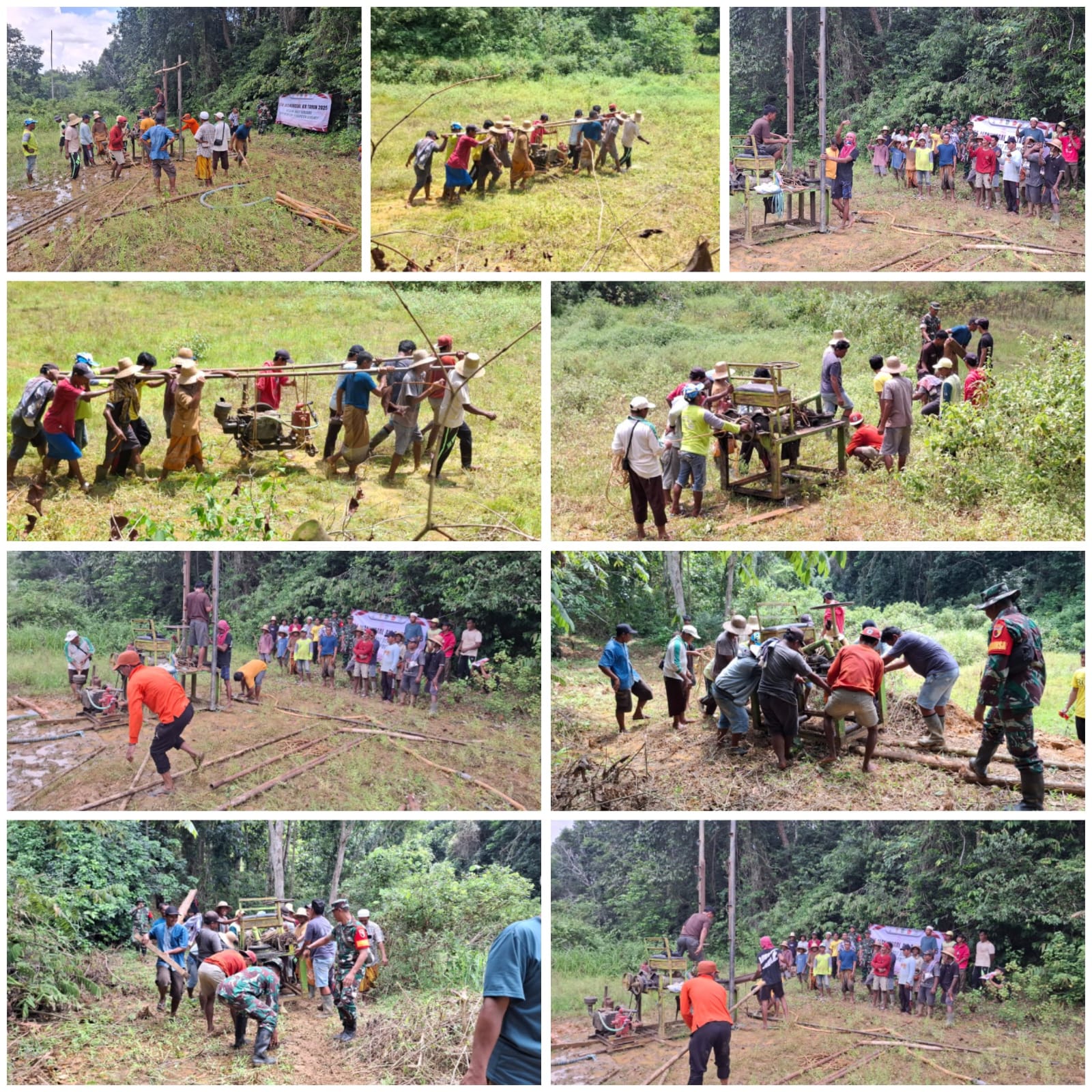 Medan sulit menuju titik pengeboran menjadi tantangan tersendiri. Anggota TNI, Kepala Desa Montorna, serta puluhan warga bergotong royong mengangkut mesin dan peralatan bor ke lokasi.