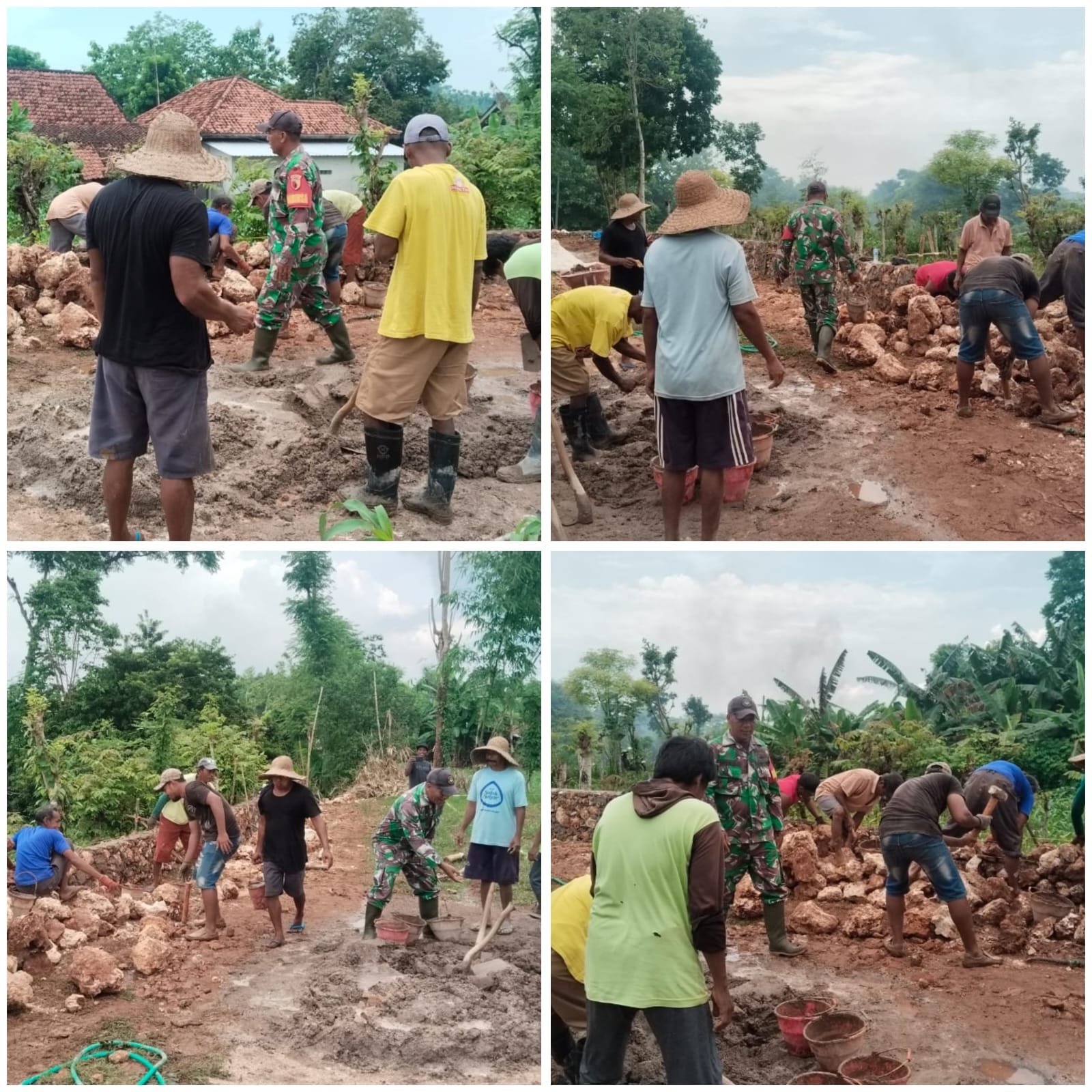 SUMENEP – Babinsa Koramil 06/Saronggi Kodim 0827/Sumenep Serka Jakfar bahu-membahu melaksanakan karya bakti pembuatan tanggul penahan jalan persawahan di desa Kambingan Timur Kecamatan Saronggi Kabupaten Sumenep, Minggu (07/12/2025).