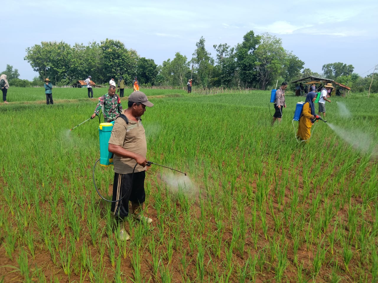 Kegiatan tersebut dilaksanakan bersama petugas penyuluh lapangan (PPL) Dinas Pertanian secara bergotong royong membantu proses penyemprotan pestisida guna mencegah serangan hama yang dapat merusak tanaman padi.