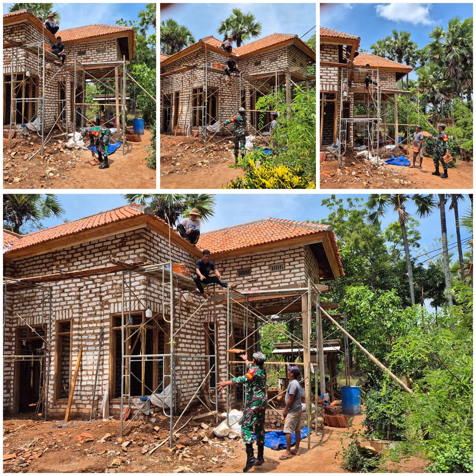 Di bawah terik matahari, Serda Jon Efendi ikut naik ke rangka atap rumah untuk membantu proses pemasangan genteng yang kini memasuki tahap akhir.