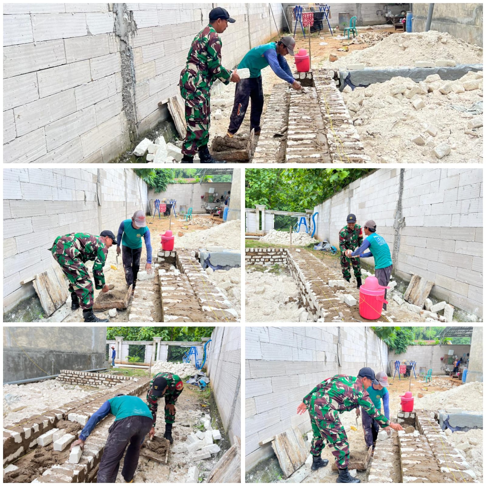 Kopda Agung terlihat bekerja berdampingan dengan warga, memastikan susunan bata pondasi rumah terpasang lurus dan kokoh.