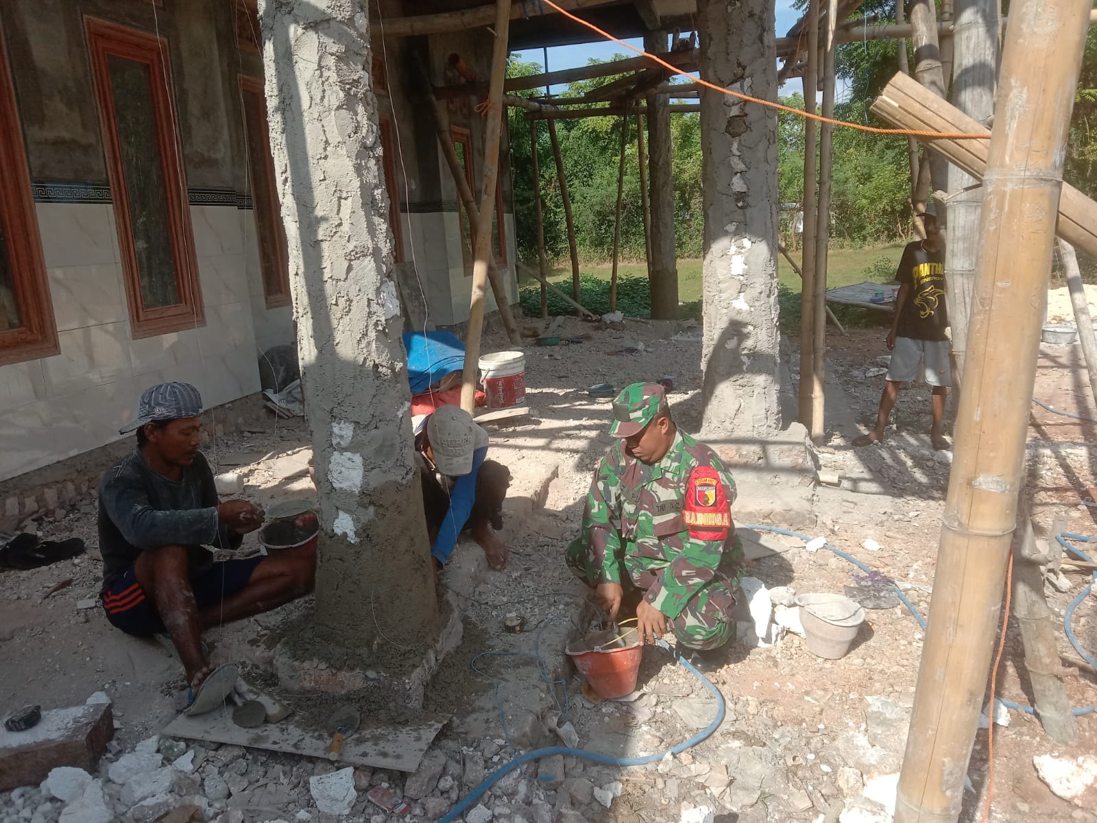 Dalam kegiatan tersebut, Babinsa turut bergotong royong bersama masyarakat mengangkat material, mencampur adukan, hingga membantu pemasangan bagian bangunan.