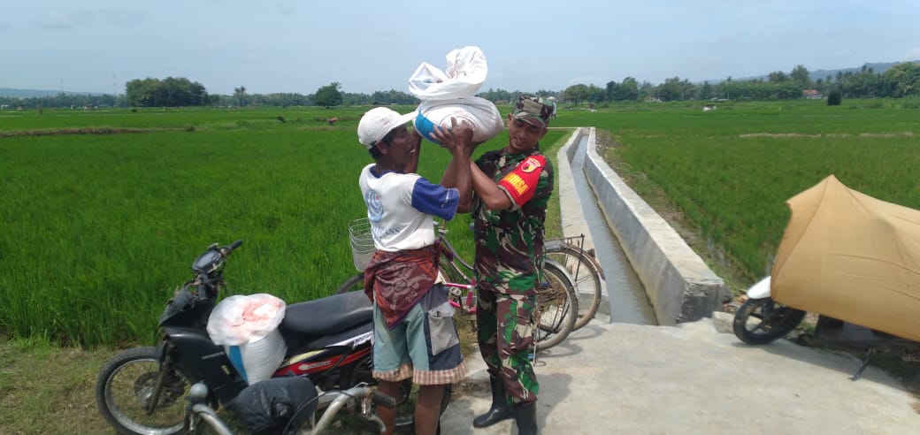 SUMENEP – Serka Ahamad Huda Babinsa Koramil Koramil 0827/05 Lenteng melaksanakan kegiatan Pendampingan Hanpangan (Ketahanan Pangan) Pemupukan padi dilahan milik Bapak Wagiman bertempat di Desa Benaresep Kecamatan Lenteng Kabupaten Sumenep. Rabu (26/03/2025).
