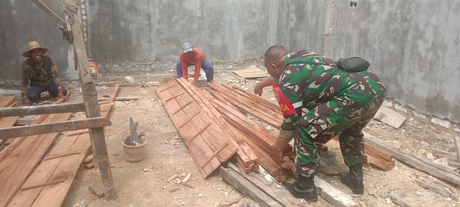 SUMENEP – Wujud kepedulian terhadap masyarakat di wilayah teritorial, Kopka Hendry Babinsa Koramil 16/Gapura Kodim 0827/Sumenep melaksanakan giat kerja bakti membantu angkat kayu untuk pembangunan rumah milik warga binaan di Desa Banjar Timur Kecamatan Gapura Kabupaten Sumenep, Jumat (4/4/2025).