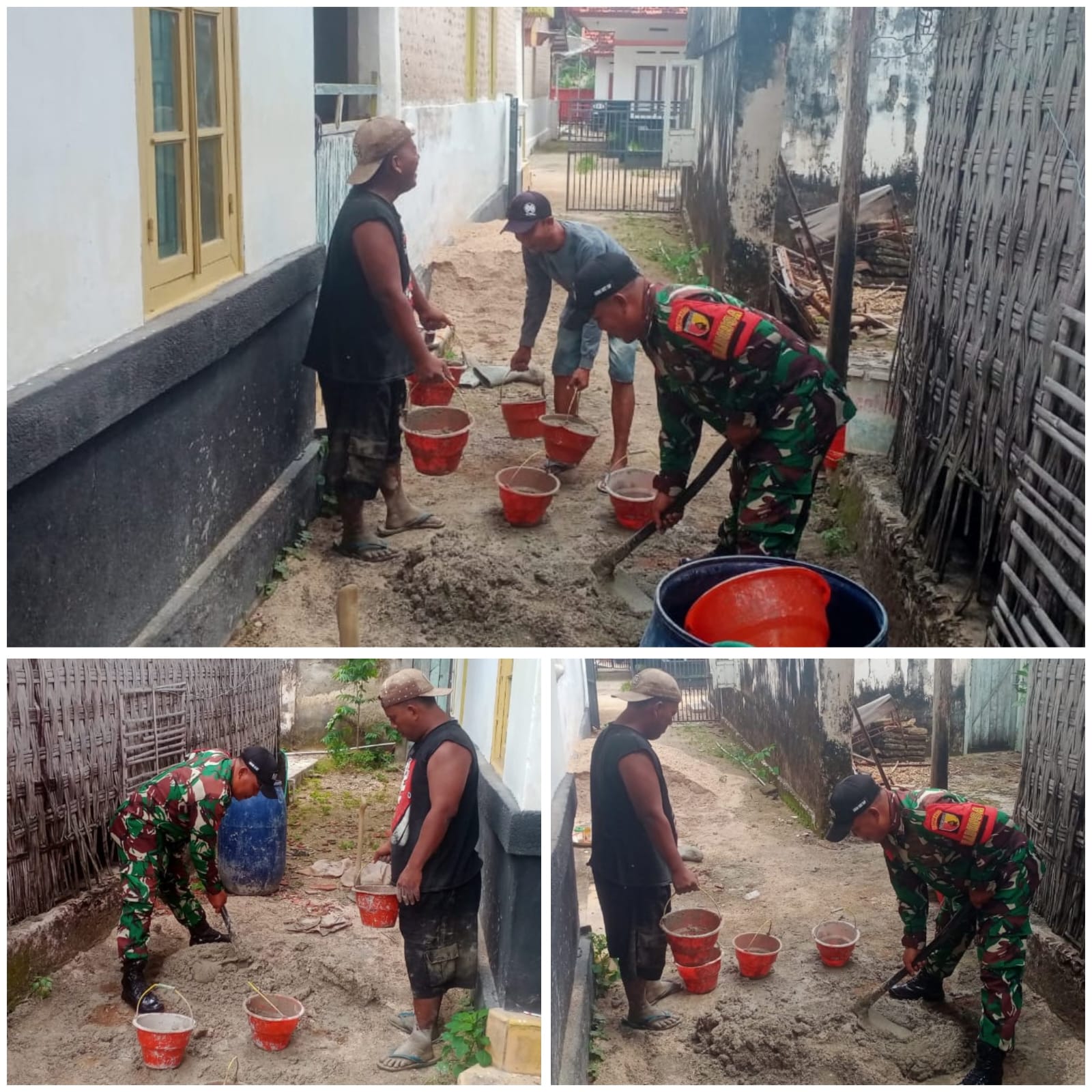 Dalam kegiatan tersebut, Babinsa bersama warga bergotong royong mengaduk campuran semen dan tanah sebagai bagian dari proses pembangunan rumah. Kehadiran Babinsa di lokasi menjadi bentuk nyata kepedulian TNI terhadap kebutuhan masyarakat sekaligus upaya memperkuat hubungan sosial di wilayah binaan.