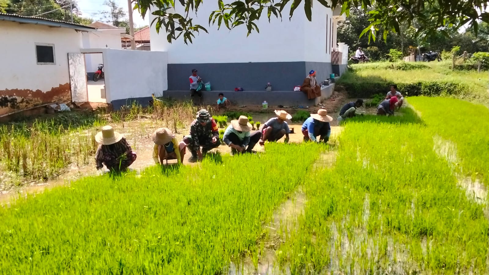 SUMENEP – Bintara Pembina Desa atau Babinsa Koramil 12/Dasuk, Kodim 0827/Sumenep Serda Feri menunjukkan kepeduliannya terhadap kesejahteraan para petani dengan turun langsung ke sawah membantu proses penanaman padi.