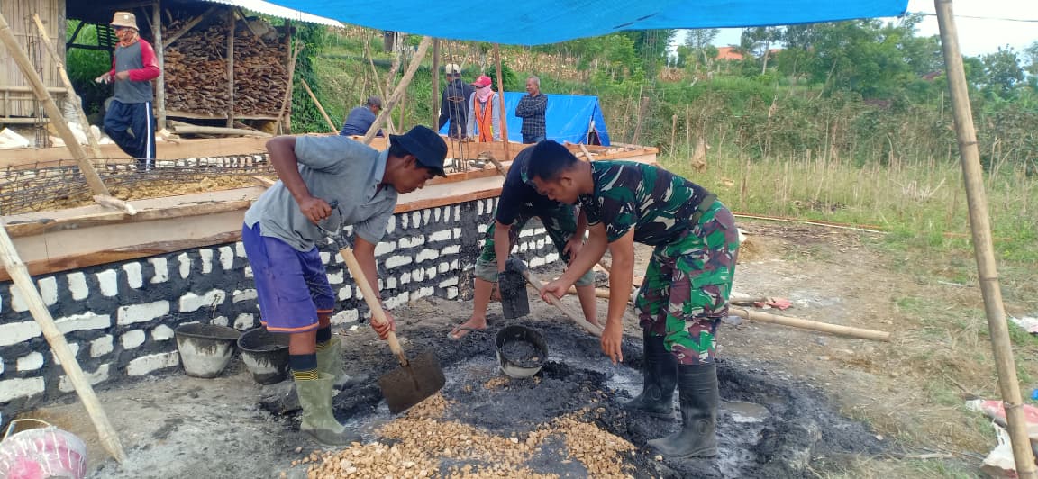 Di lokasi pembangunan, Praka Vidi Widi terlihat mengaduk material secara teliti sebelum proses pengecoran dilakukan. Penguatan pondasi menjadi prioritas agar kedudukan rumah lebih tinggi dan stabil.