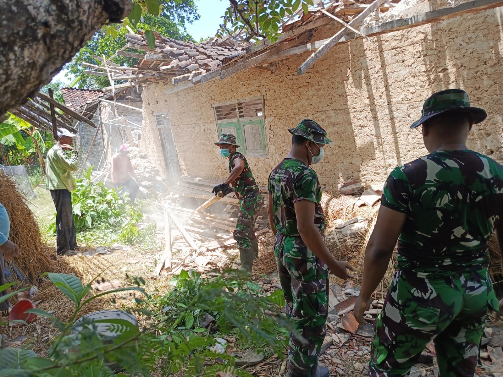 Kegiatan ini berlangsung di Dusun Rok Korok, Desa Pancor, Kecamatan Gayam. Anggota Koramil 0827/20 Sapudi bersama masyarakat setempat turun langsung menyingkirkan puing-puing bangunan yang roboh.
