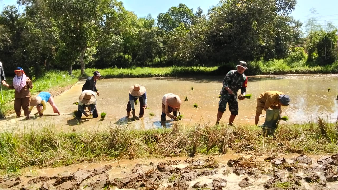 Kali ini, Babinsa Koramil 0827/12 Dasuk Serda Feri turun ke sawah untuk pendampingan masyarakat petani dalam proses penanaman padi.
