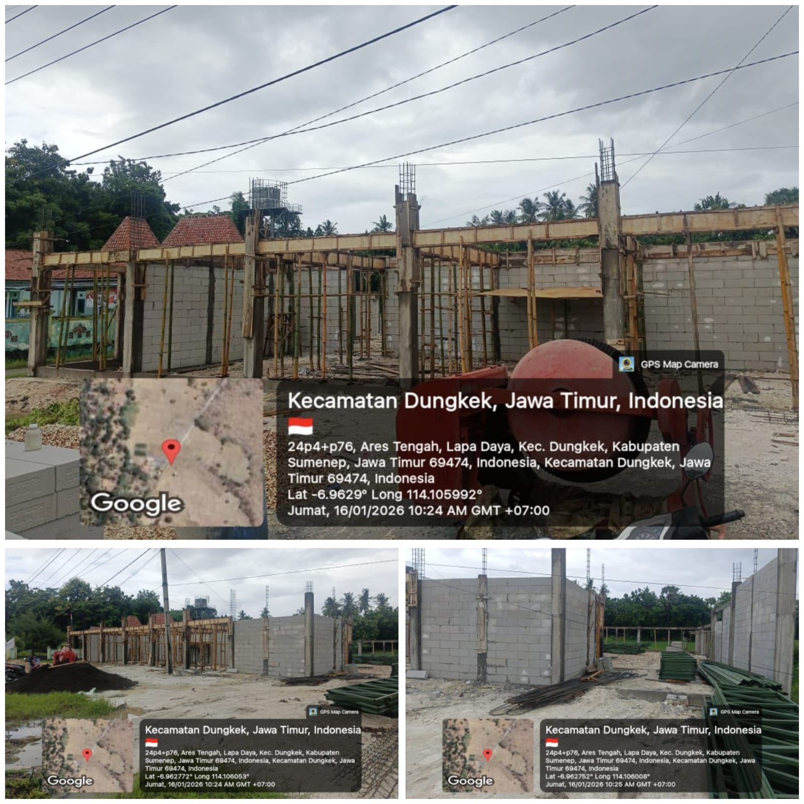 SUMENEP – Pembangunan Koperasi Desa/Kelurahan Merah Putih (KDKMP) di Desa Lapa Daya, Kecamatan Dungkek, Kabupaten Sumenep, Jawa Timur, terus menunjukkan progres positif. Hingga Jumat (16/1/2026), pengerjaan fisik bangunan telah memasuki tahap struktur utama.