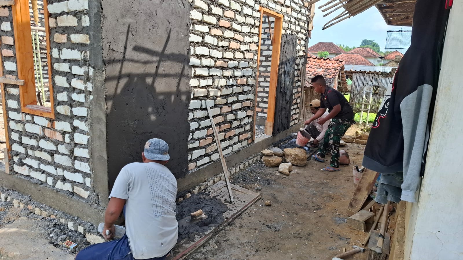 Pengerjaan saat ini memasuki tahap pemelesteran dinding bagian luar rumah. Serda Axel Arthur Rehuel bersama personel Satgas TMMD dan warga setempat bergotong royong menyelesaikan tahapan tersebut guna memperkuat struktur bangunan sekaligus meningkatkan kualitas hunian.