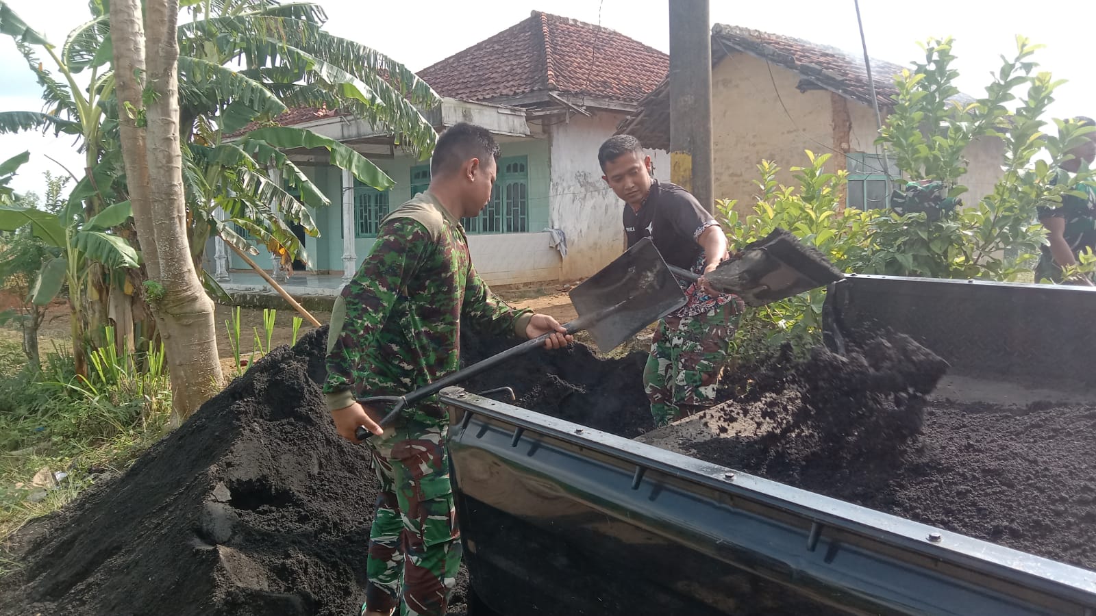 Warga sekitar turut membantu proses penurunan material sebagai bentuk dukungan dan kebersamaan. Semangat gotong royong antara Satgas TMMD dan masyarakat menjadi wujud nyata sinergi dalam membangun desa.